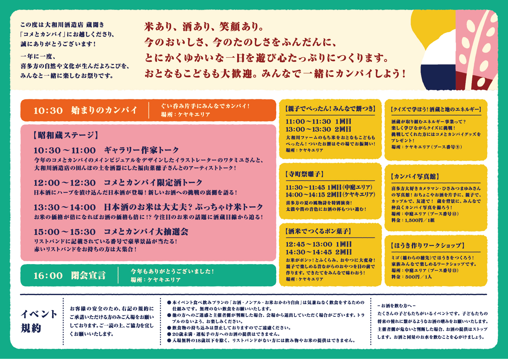 大和川酒造店のお酒はほぼ全て自社栽培のお米を使用しているって知ってましたか? 大和川グループの農業法人である「大和川ファーム」の美味しいお米は、なんと1日何度でもおかわり自由! お好きなご飯のお供を、他出展者さんからチョイスして楽しんでください! 提供予定のお米:コシヒカリ・里山のつぶ・天のつぶ・ひとめぼれ・夢の香(酒米)・山田錦(酒米)